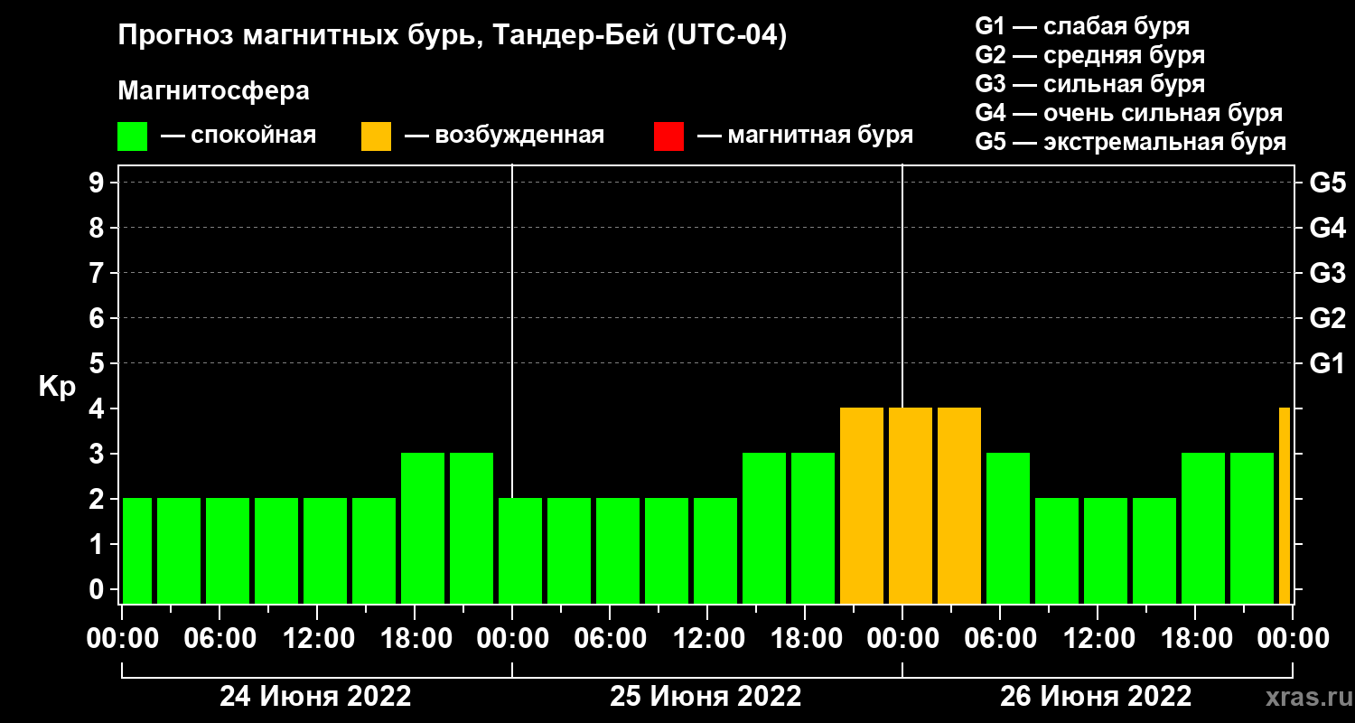 Прогноз магнитных бурь в Тандер-Бейе на 24 июня 2022 года