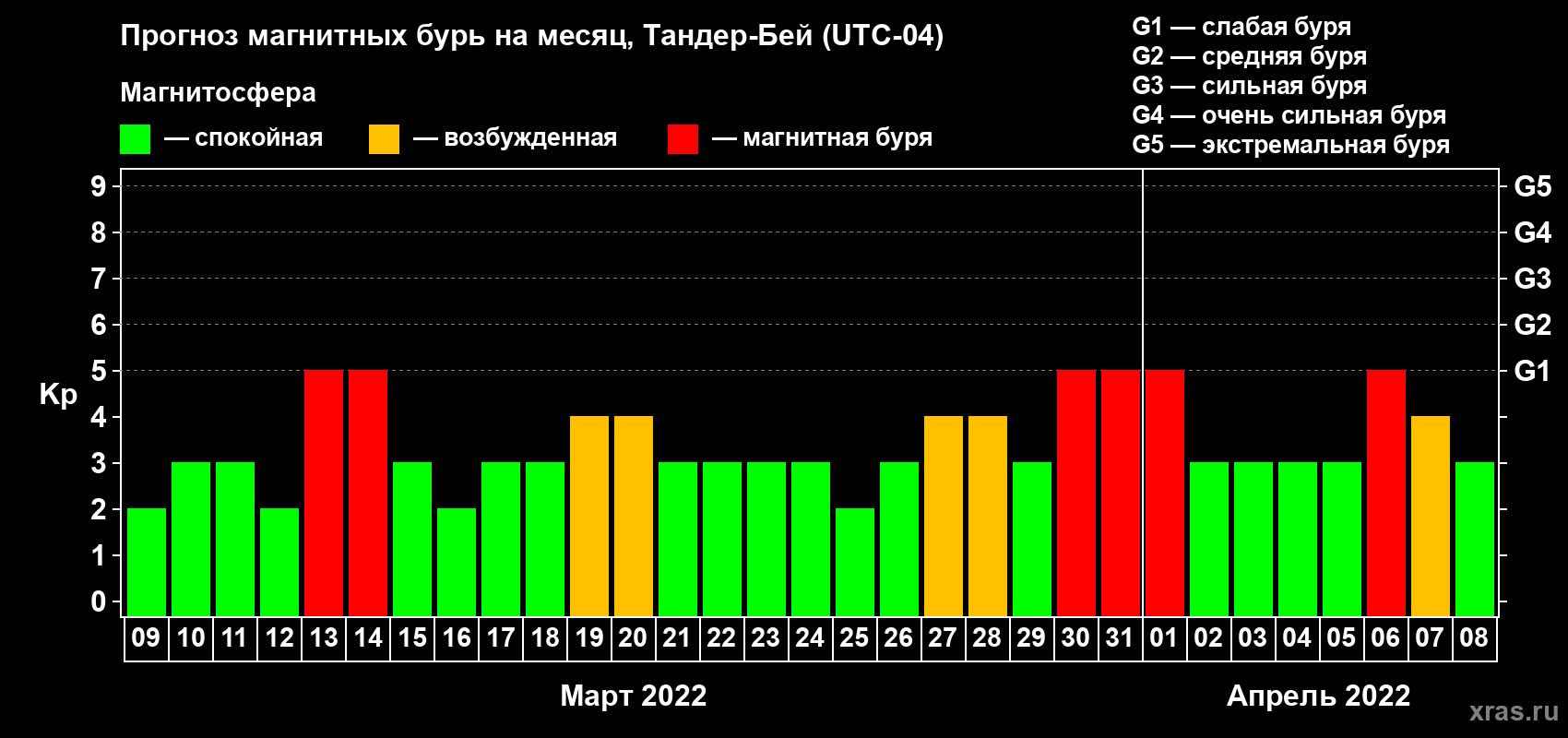 Прогноз максимального суточного геомагнитного индекса Kp на 1 месяц (31 день) с 09 марта по 08 апреля 2022 г