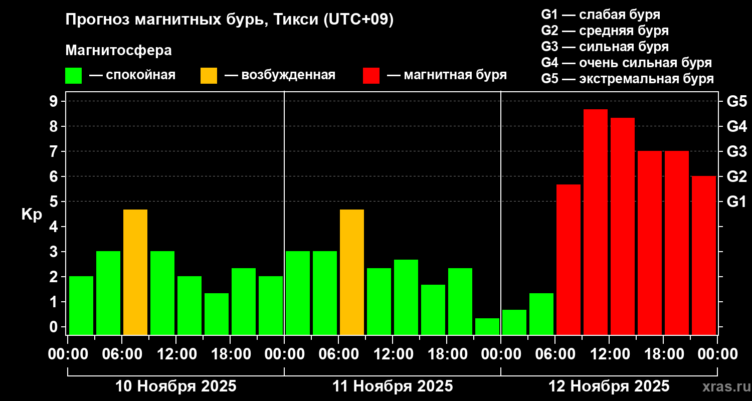 Прогноз магнитных бурь Тикси — 10 ноября 2025 года