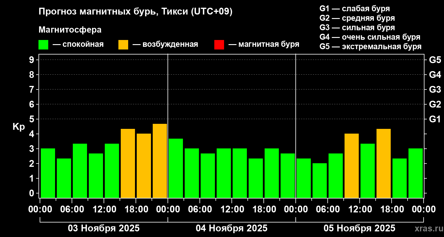 Прогноз магнитных бурь Тикси — 3 ноября 2025 года