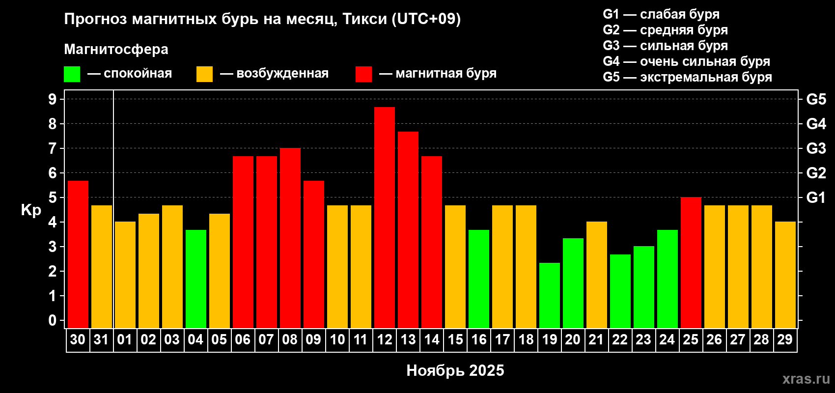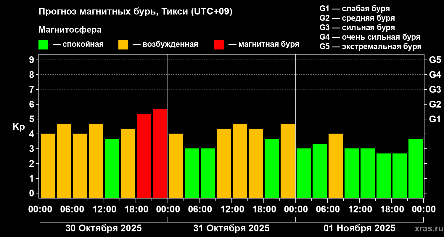 Прогноз магнитных бурь Тикси — 30 октября 2025 года