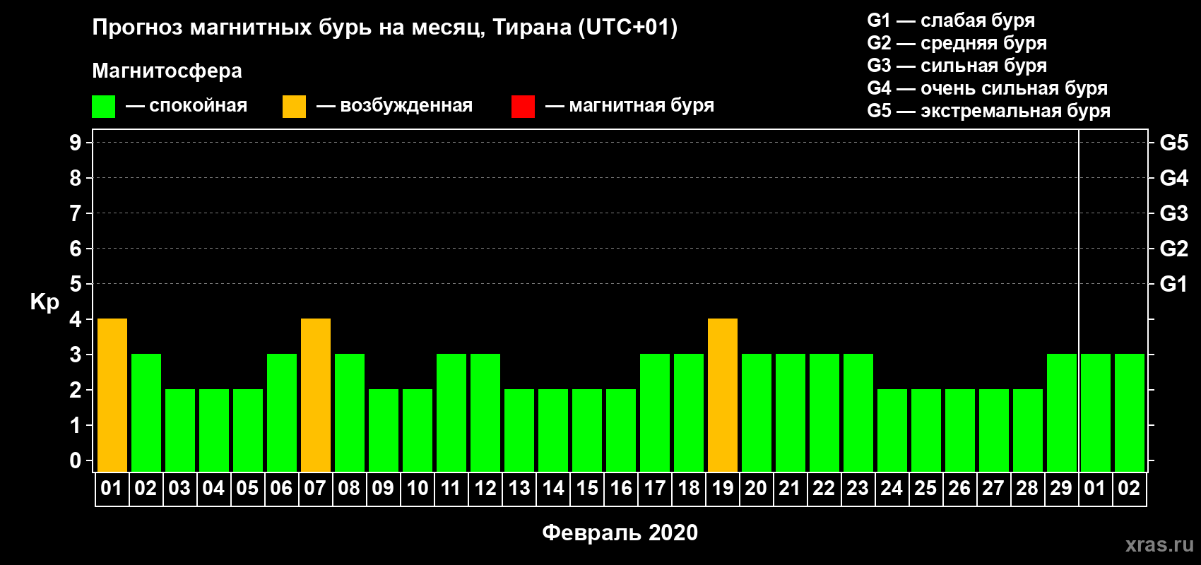 Прогноз магнитных бурь в Тиране — 1 февраля 2020 года