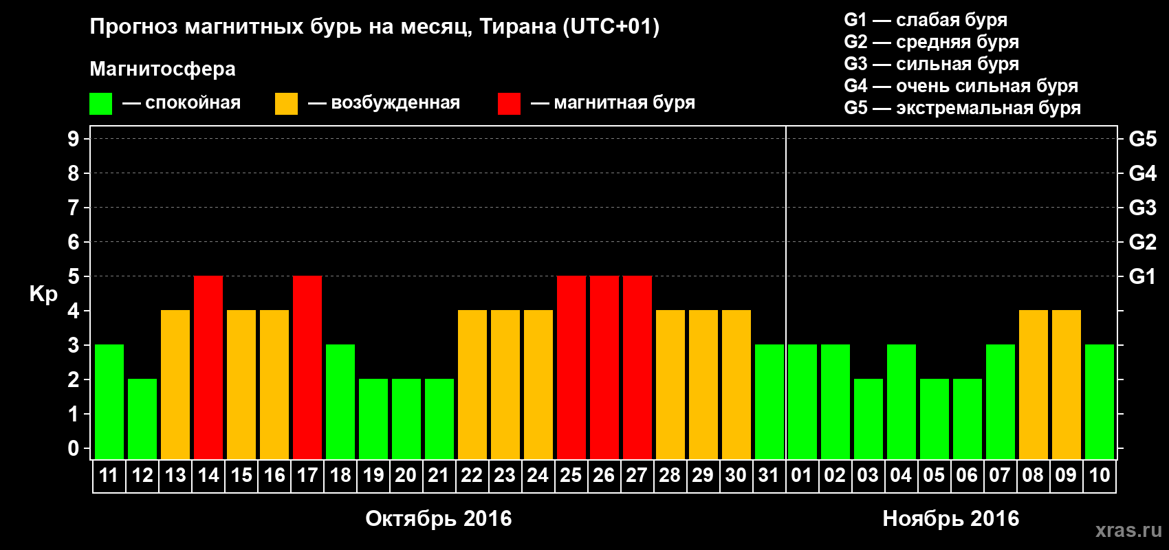 Прогноз магнитных бурь в Тиране — 11 октября 2016 года