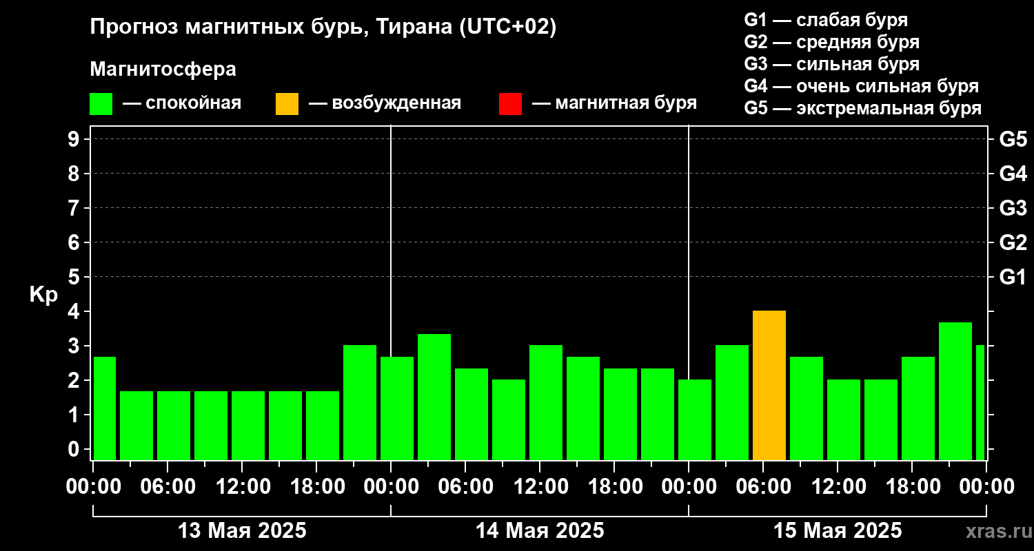Прогноз магнитных бурь в Тиране на 13 мая 2025 года