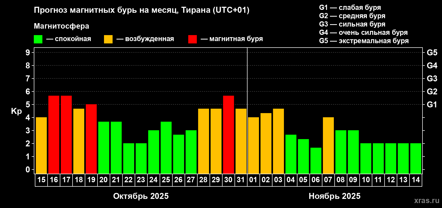 Прогноз магнитных бурь в Тиране — 15 октября 2025 года