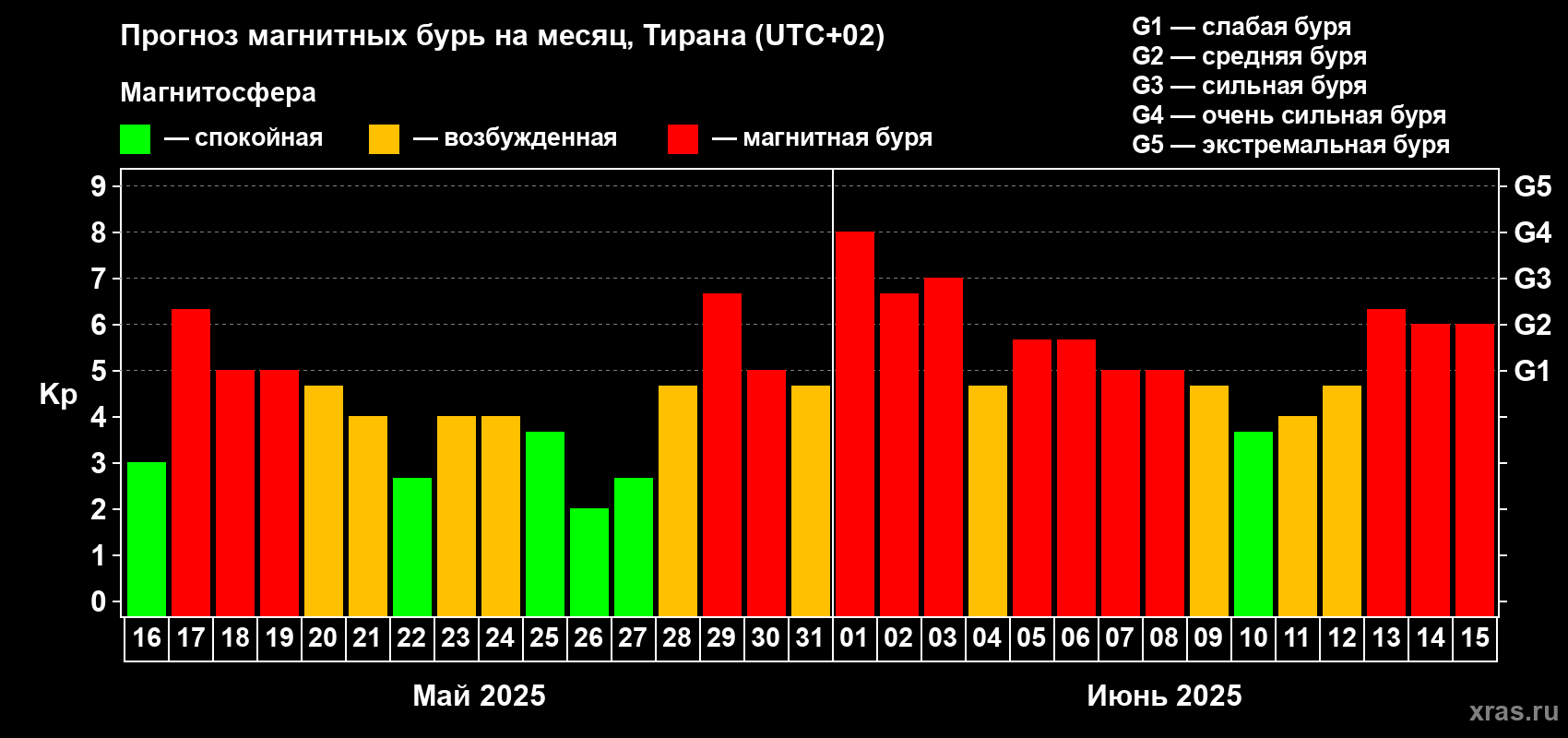 Прогноз магнитных бурь в Тиране — 16 мая 2025 года