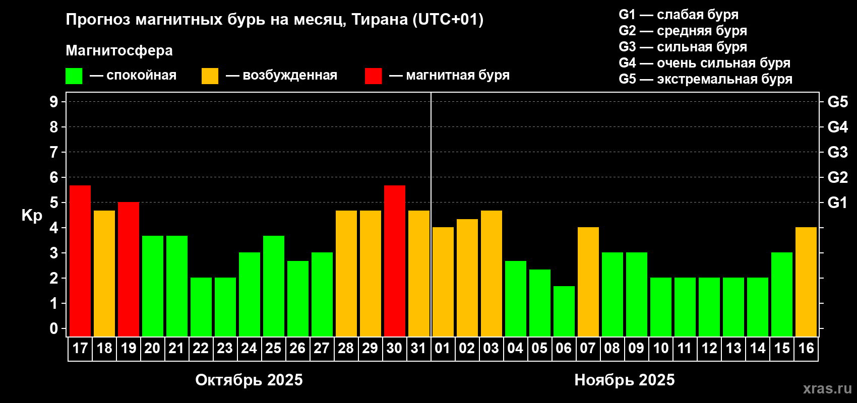 Прогноз магнитных бурь в Тиране — 17 октября 2025 года