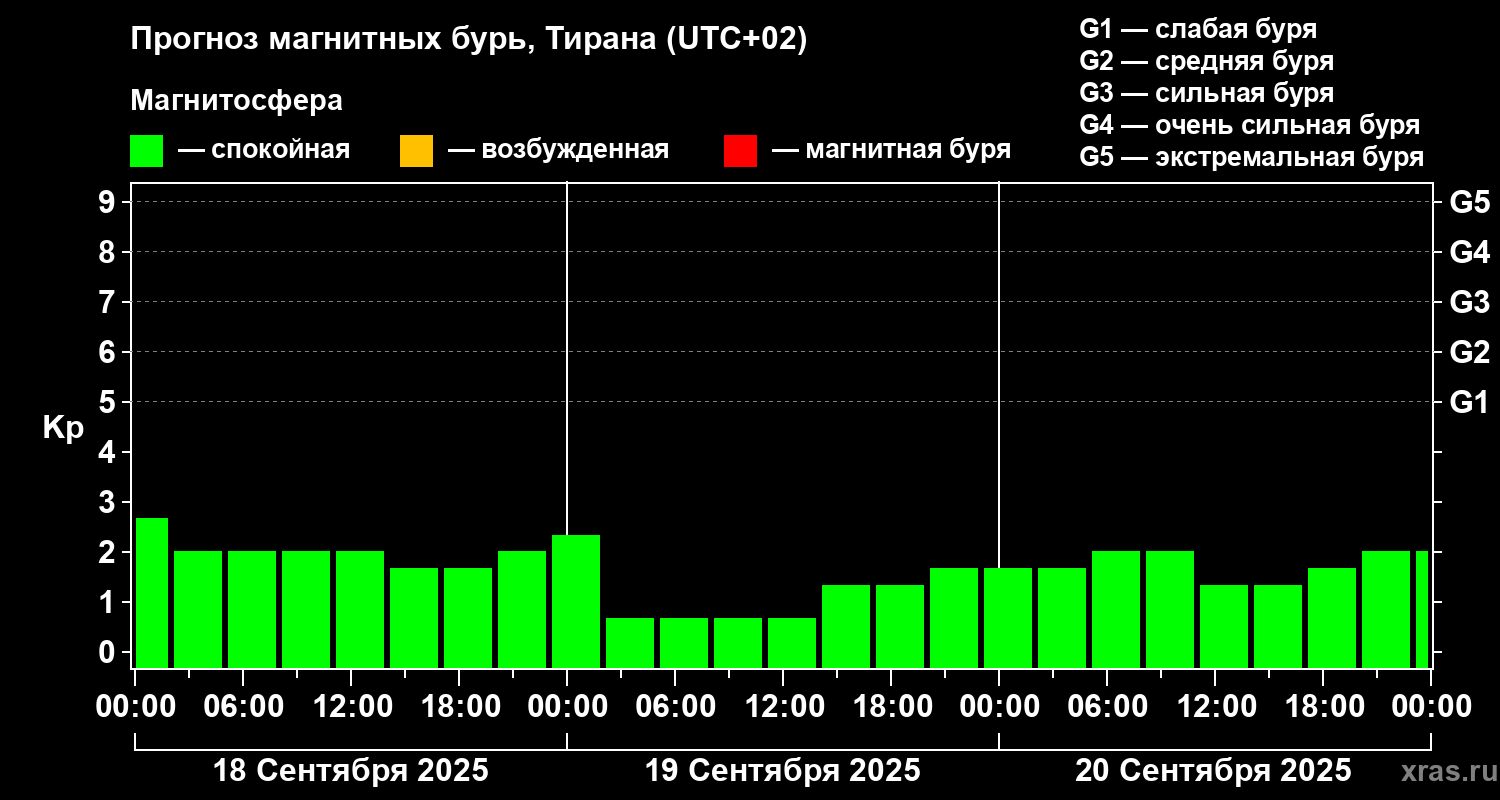 Прогноз магнитных бурь в Тиране на 18 сентября 2025 года