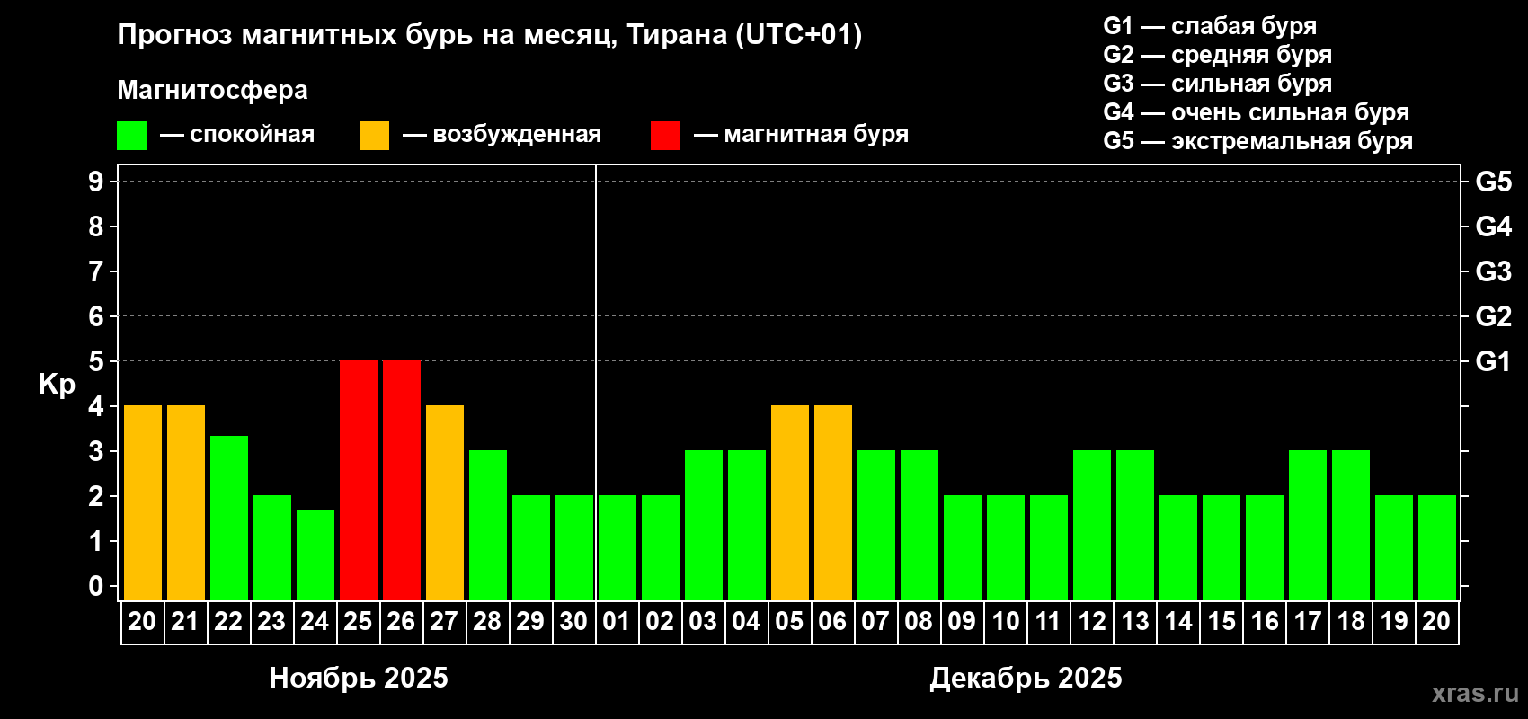 Прогноз магнитных бурь в Тиране — 20 ноября 2025 года