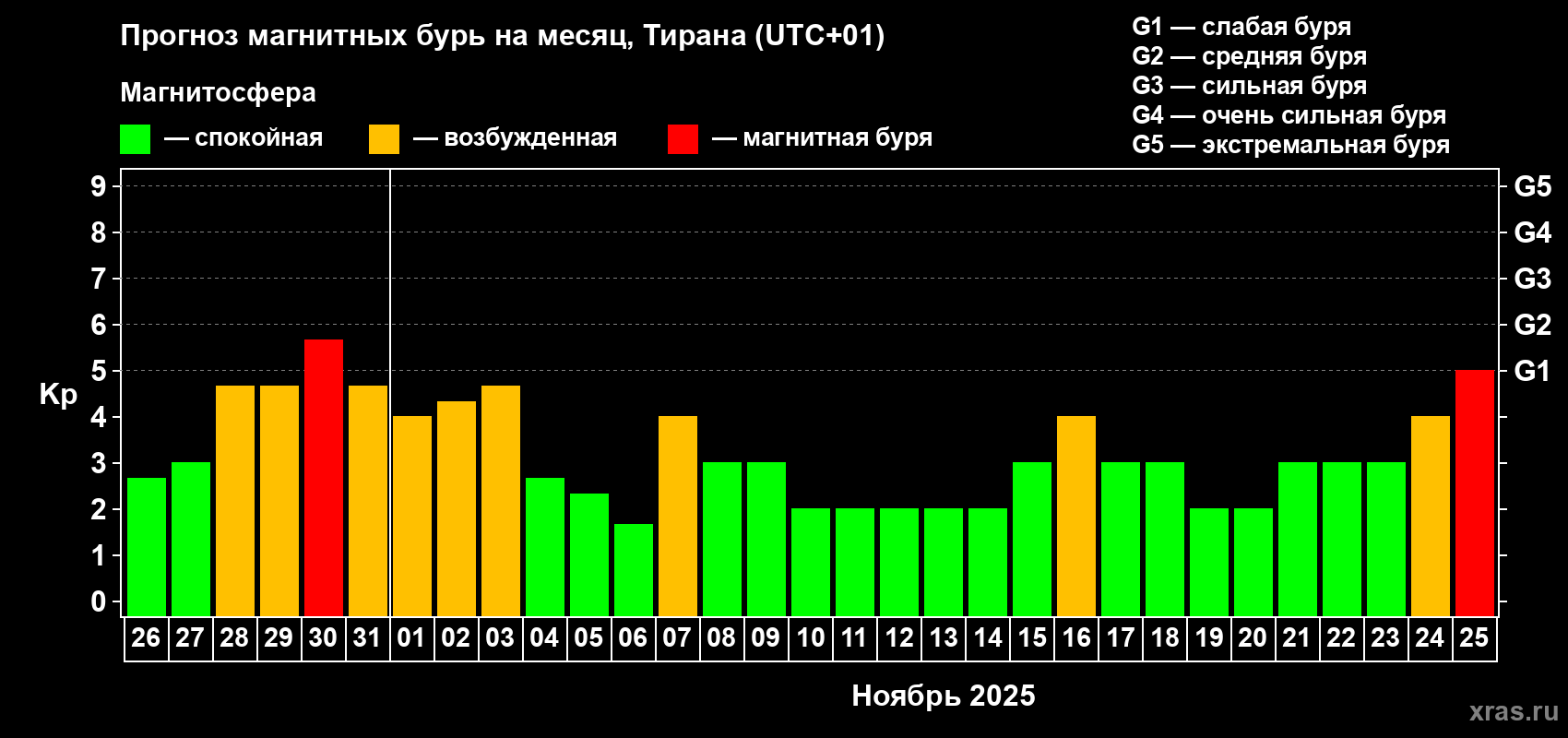 Прогноз магнитных бурь в Тиране — 26 октября 2025 года