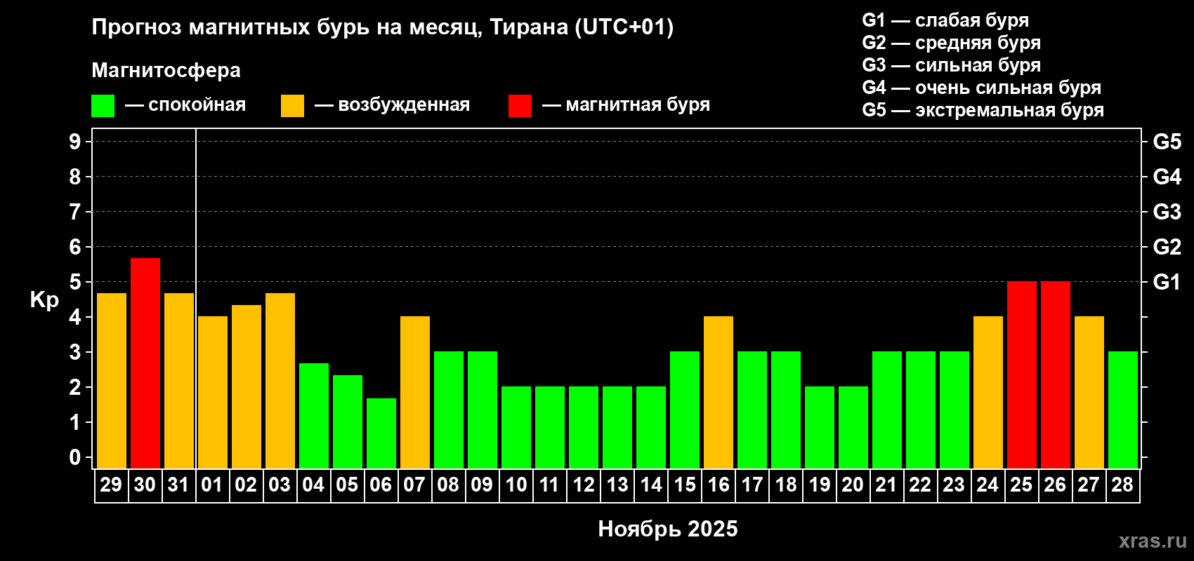 Прогноз магнитных бурь в Тиране — 29 октября 2025 года