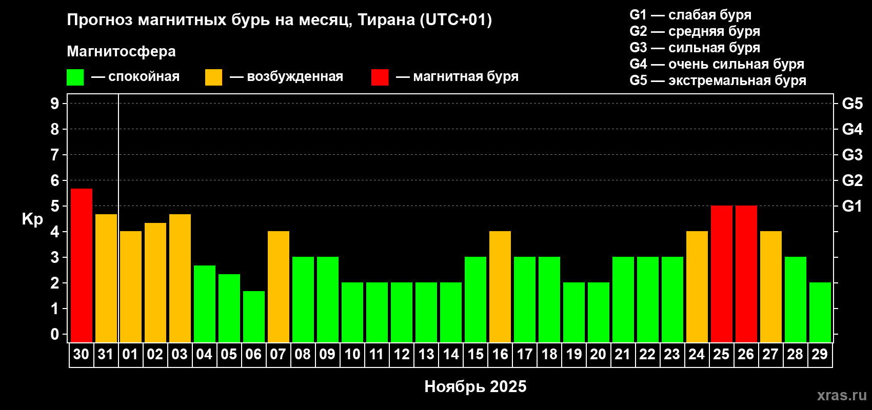 Прогноз магнитных бурь в Тиране — 30 октября 2025 года