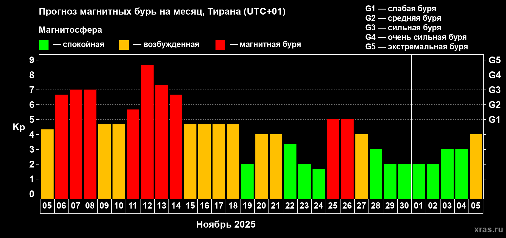 Прогноз магнитных бурь в Тиране — 5 ноября 2025 года