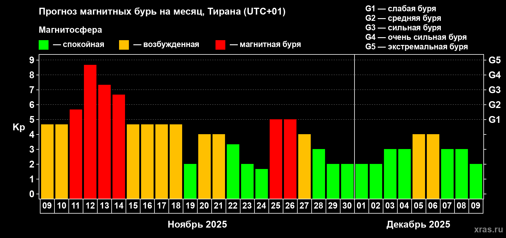 Прогноз магнитных бурь в Тиране — 9 ноября 2025 года