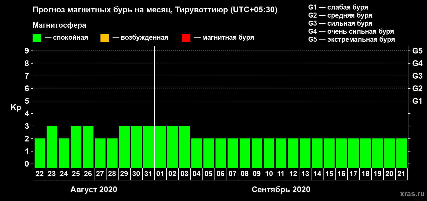Прогноз магнитных бурь в Тирувоттиюре — 22 августа 2020 года