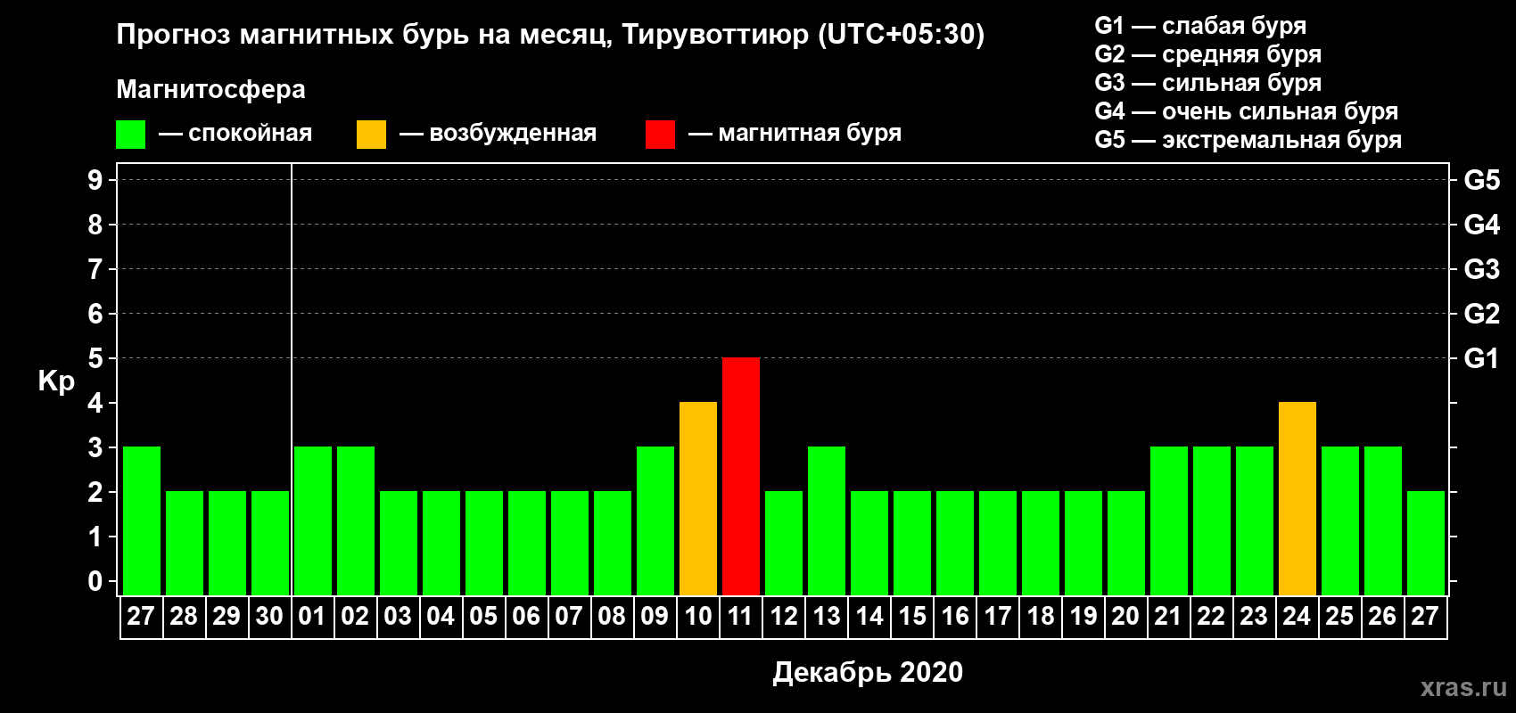 Прогноз магнитных бурь в Тирувоттиюре — 27 ноября 2020 года