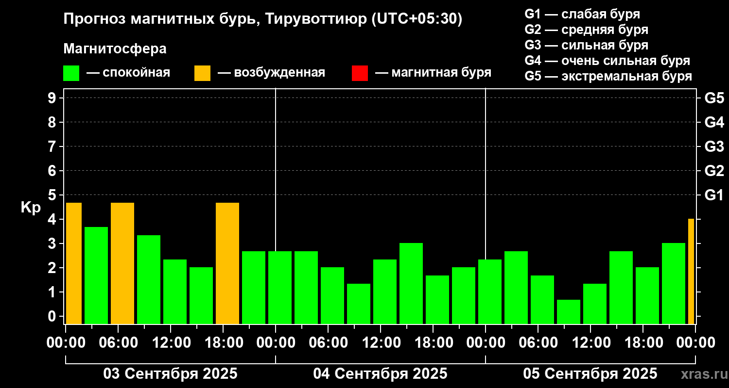 Прогноз магнитных бурь в Тирувоттиюре — 3 сентября 2025 года