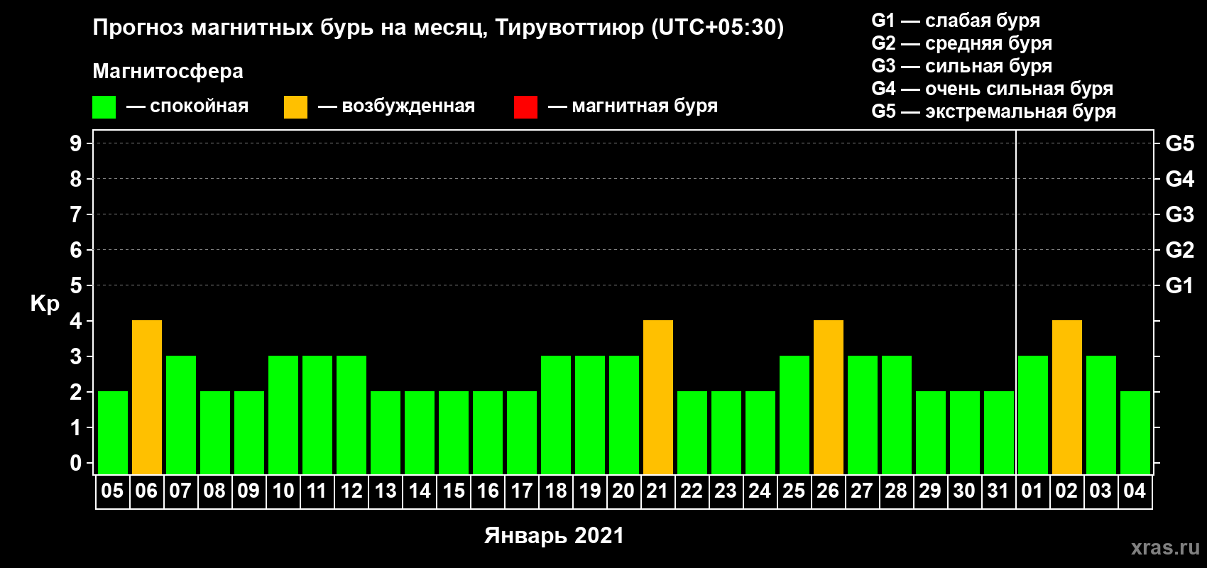 Прогноз магнитных бурь в Тирувоттиюре — 5 января 2021 года