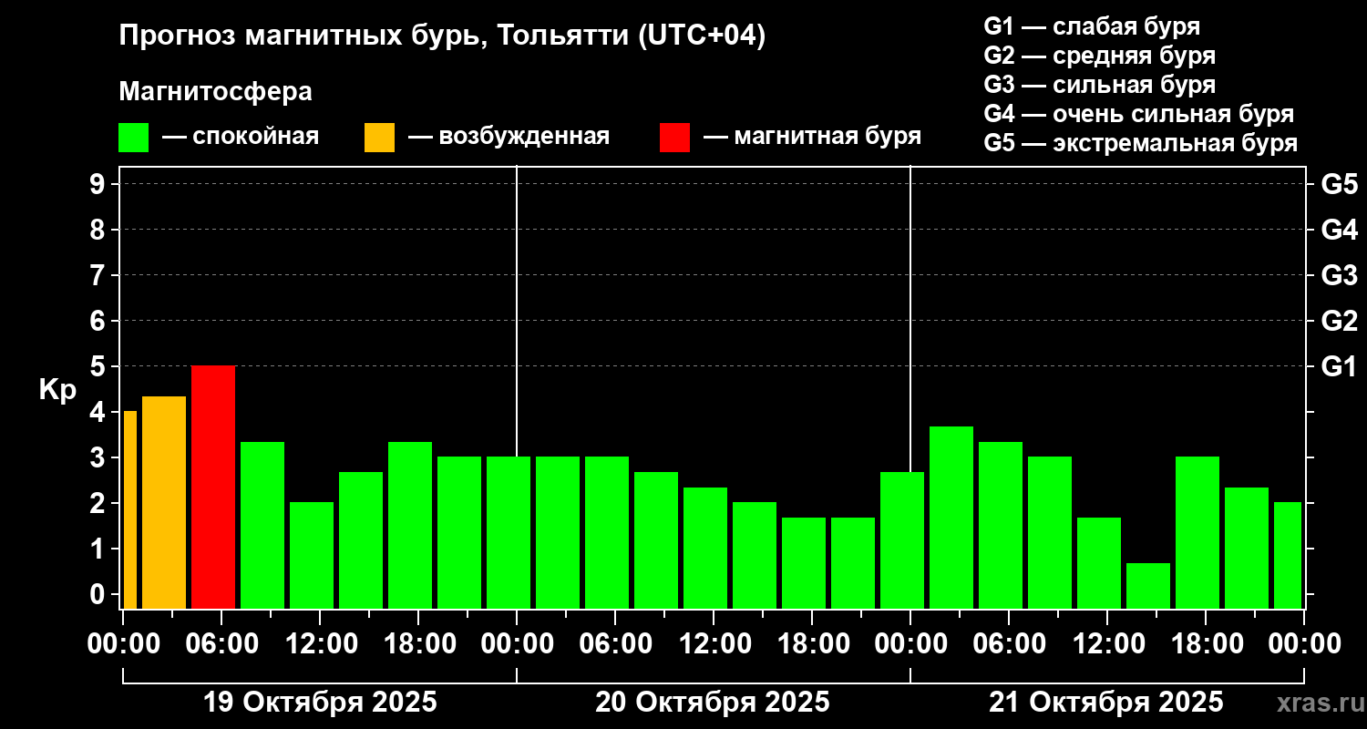 Прогноз магнитных бурь Тольятти — 19 октября 2025 года