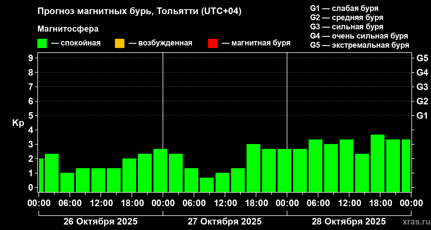 Прогноз магнитных бурь Тольятти — 26 октября 2025 года