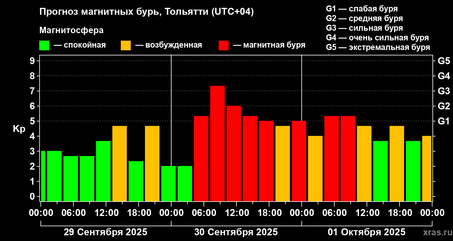 Прогноз магнитных бурь Тольятти — 29 сентября 2025 года