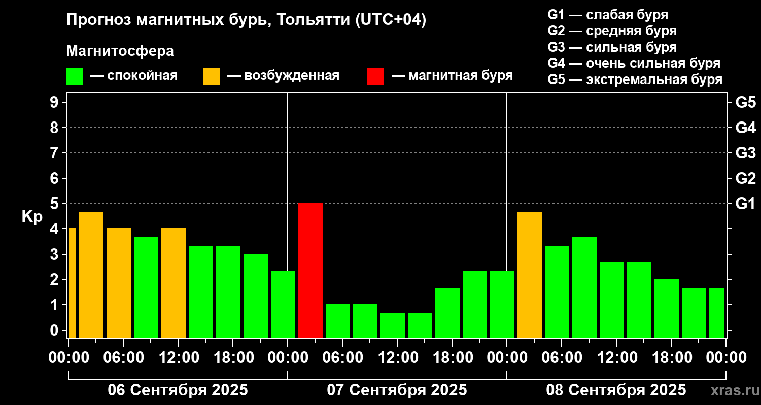 Прогноз магнитных бурь Тольятти — 6 сентября 2025 года