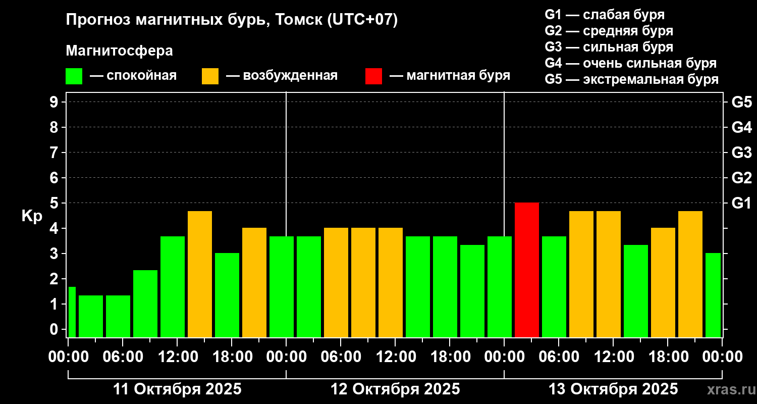 Прогноз магнитных бурь в Томске на 11 октября 2025 года