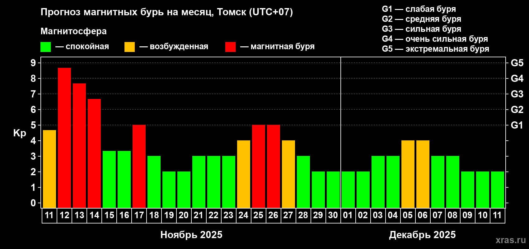 Прогноз магнитных бурь в Томске на 11 ноября 2025 года