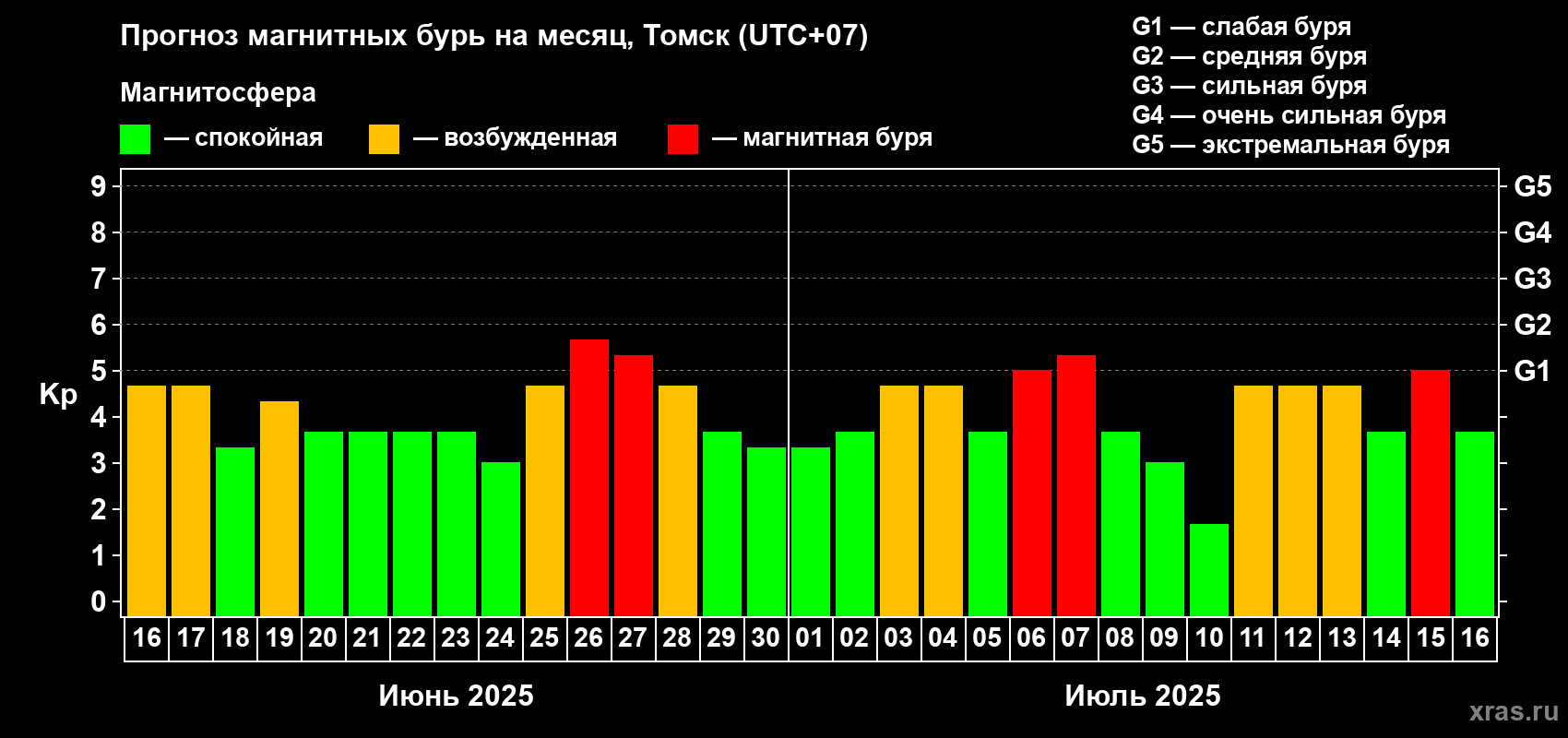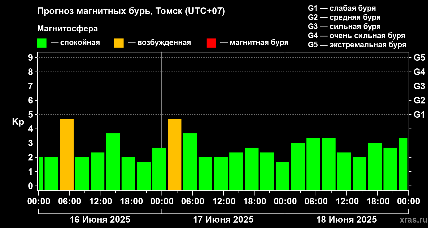 Прогноз магнитных бурь в Томске на 16 июня 2025 года