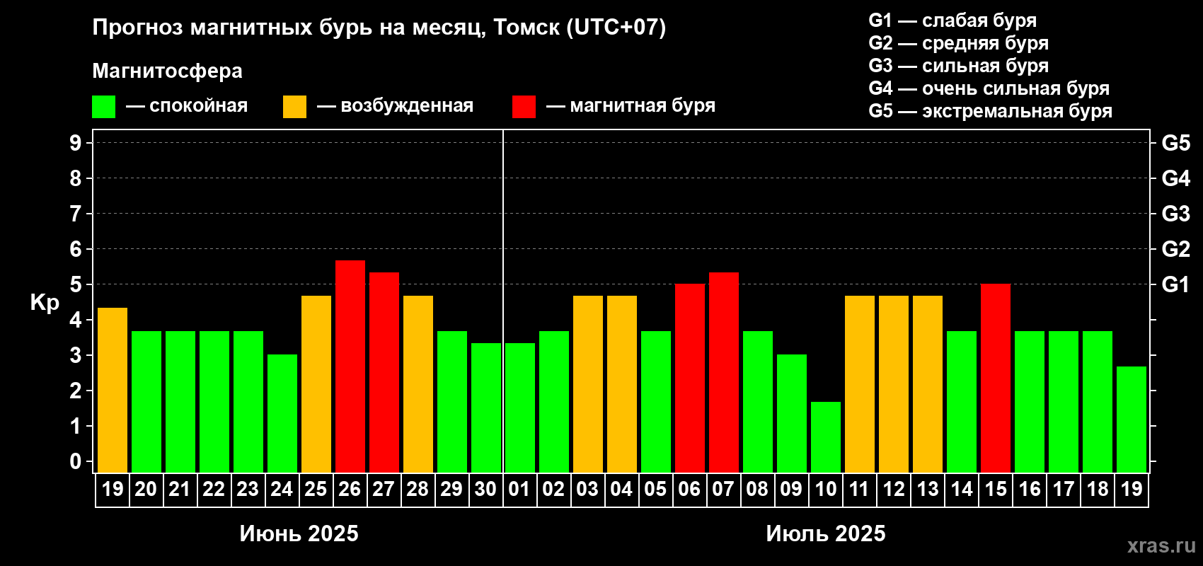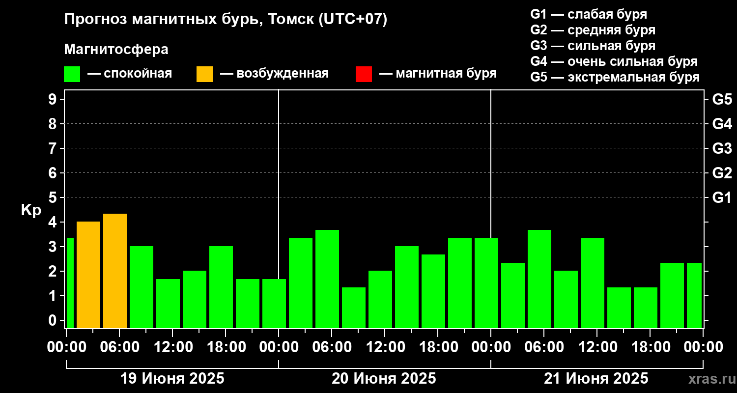 Прогноз магнитных бурь в Томске на 19 июня 2025 года