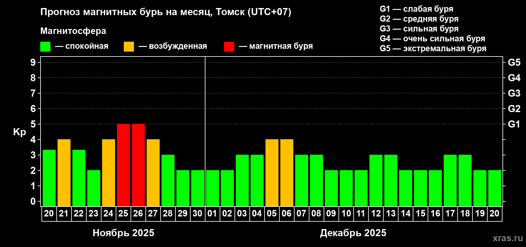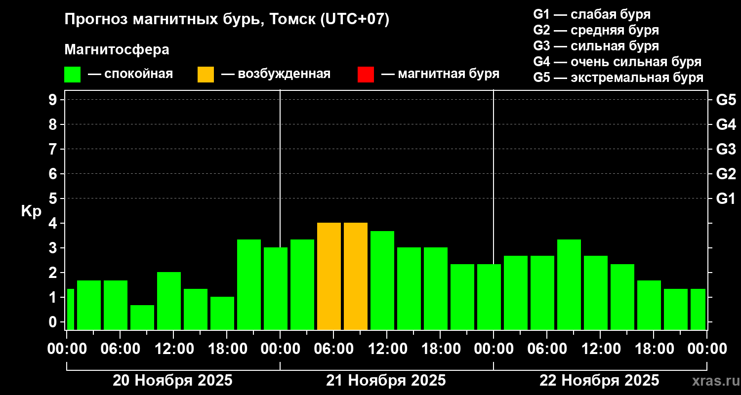 Прогноз магнитных бурь в Томске на 20 ноября 2025 года