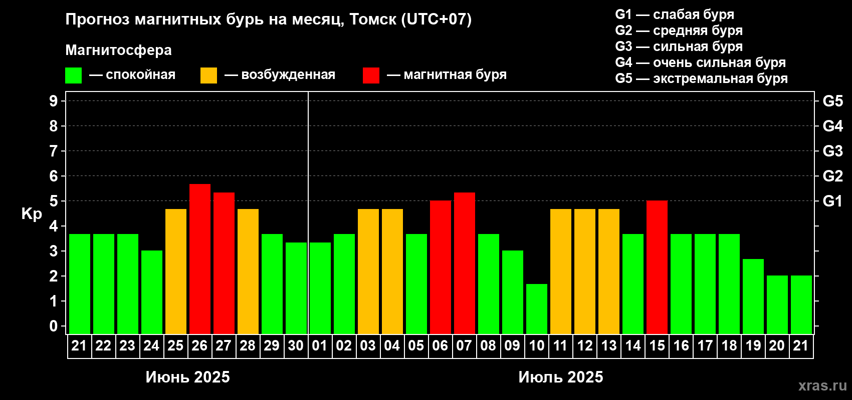 Прогноз магнитных бурь в Томске на 21 июня 2025 года