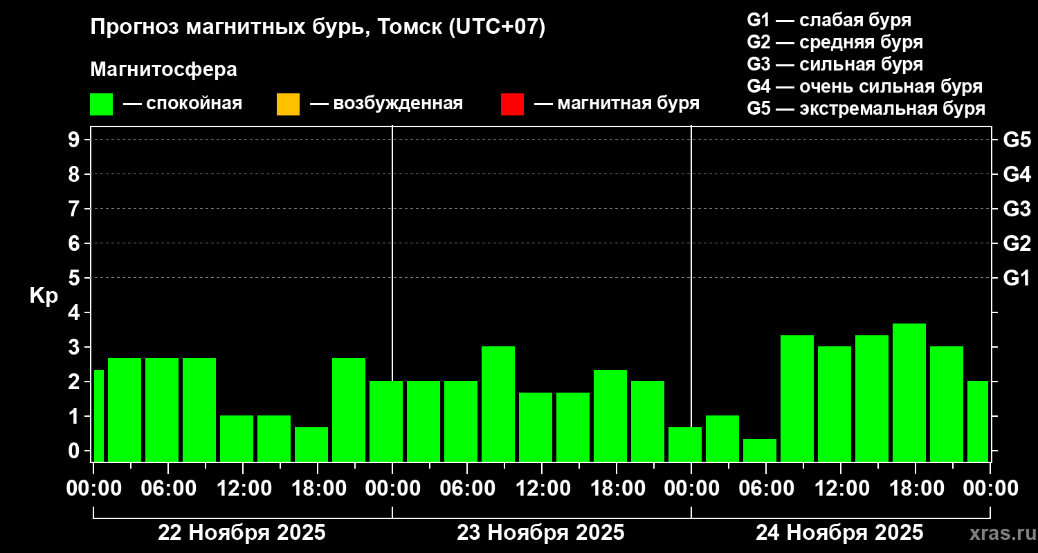 Прогноз магнитных бурь в Томске на 22 ноября 2025 года