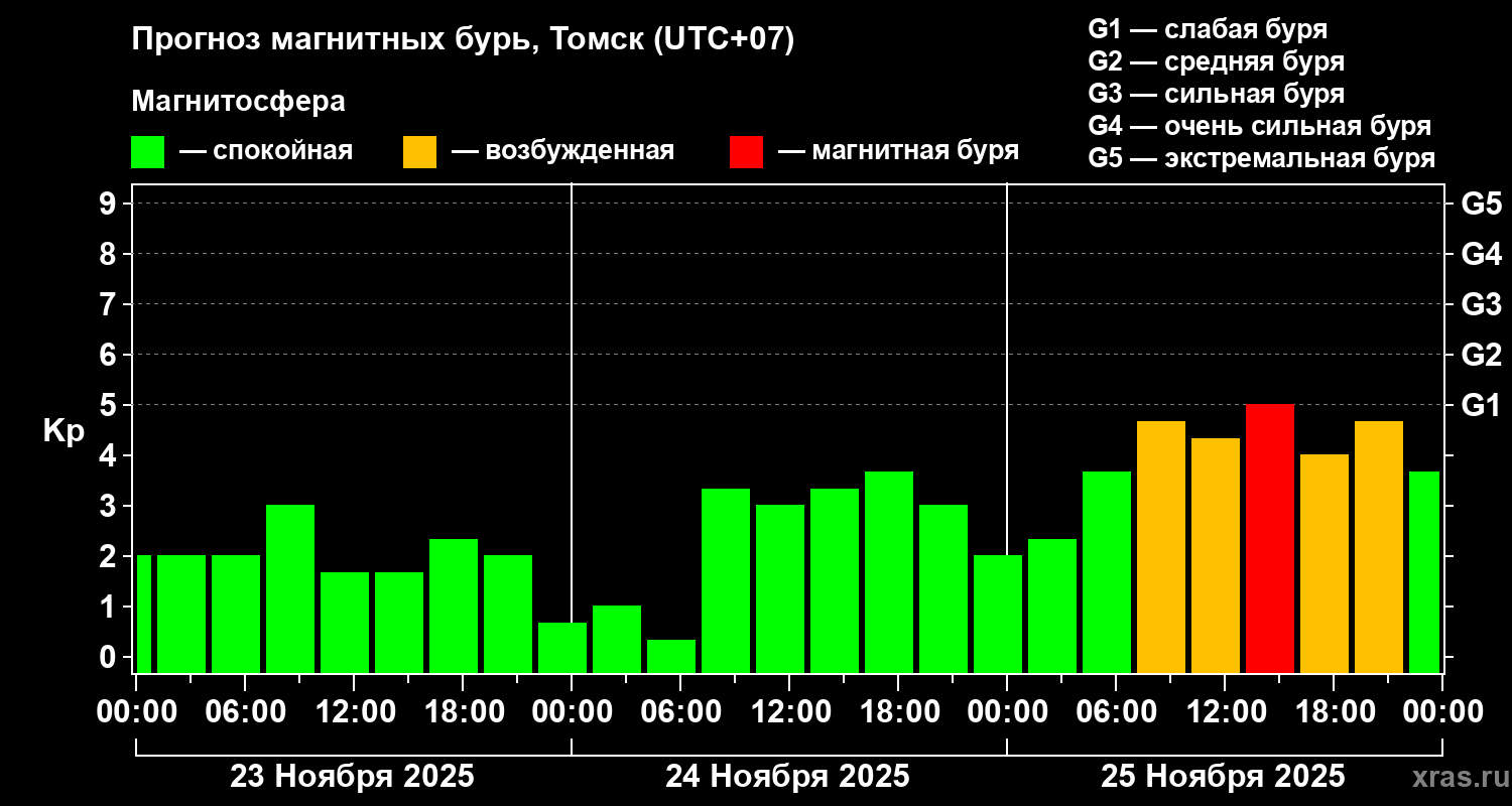 Прогноз магнитных бурь в Томске на 23 ноября 2025 года