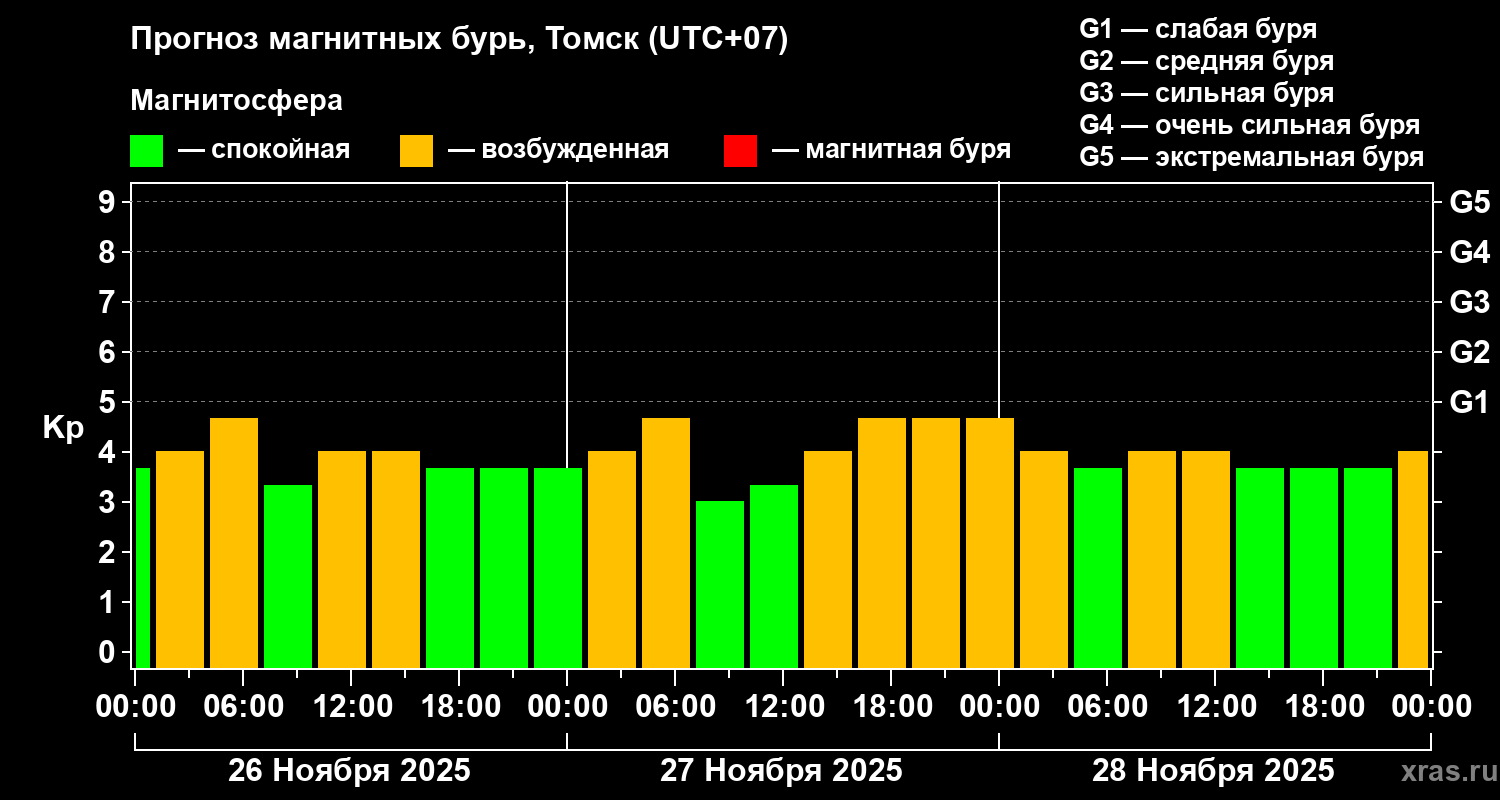 Прогноз магнитных бурь в Томске на 26 ноября 2025 года