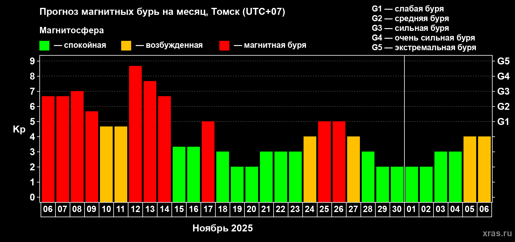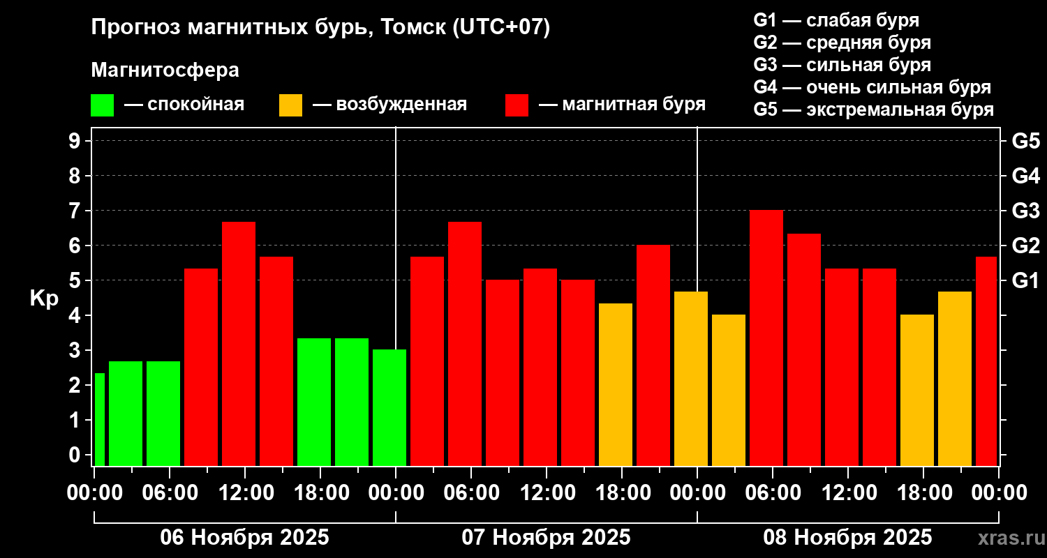 Прогноз магнитных бурь в Томске — 6 ноября 2025 года