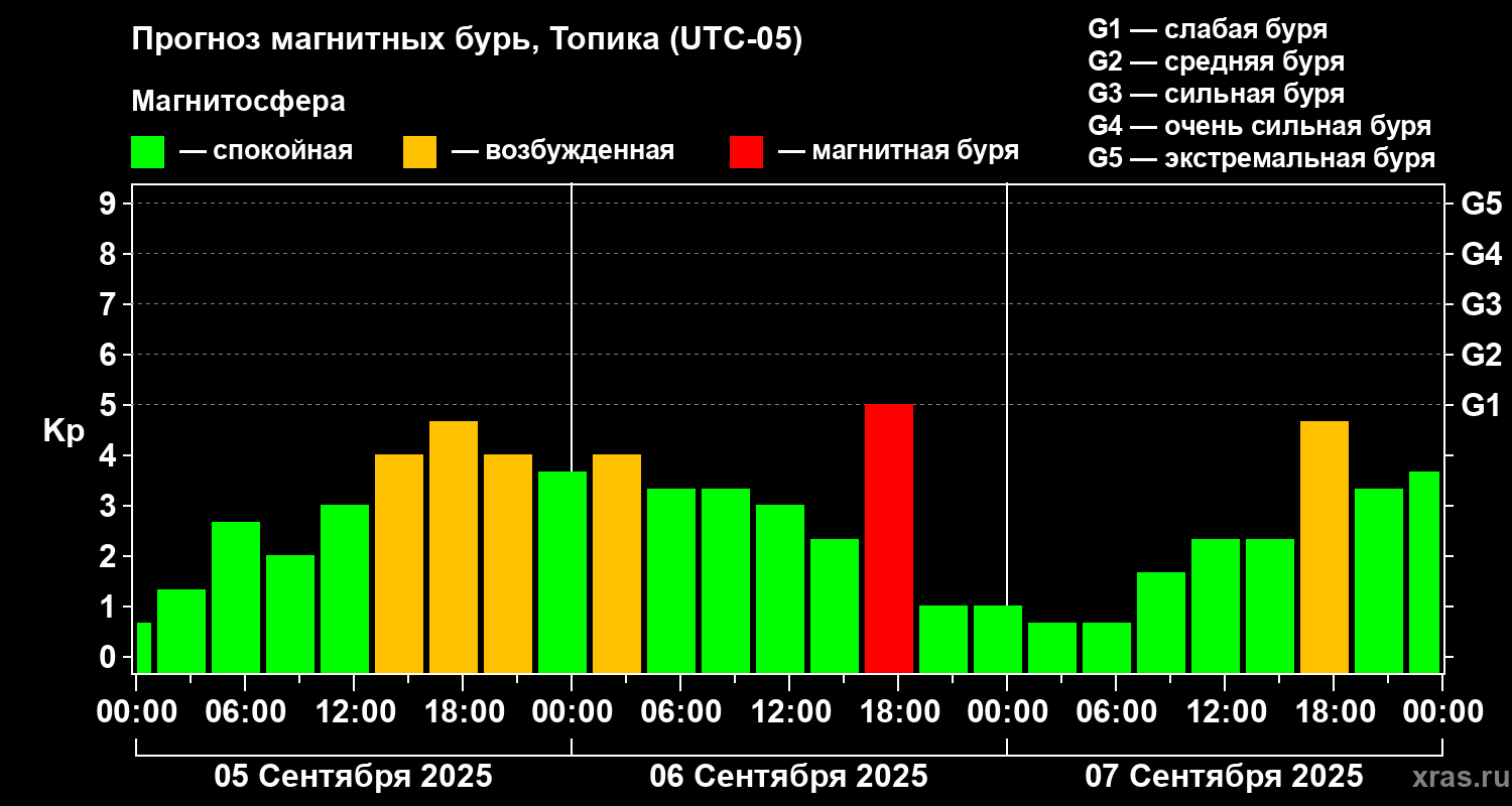 Прогноз магнитных бурь в Топике на 5 сентября 2025 года