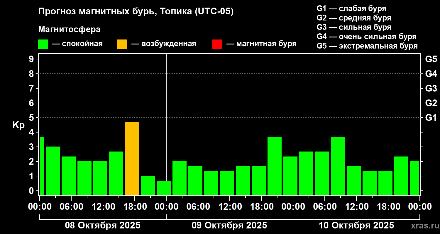 Прогноз магнитных бурь в Топике — 8 октября 2025 года