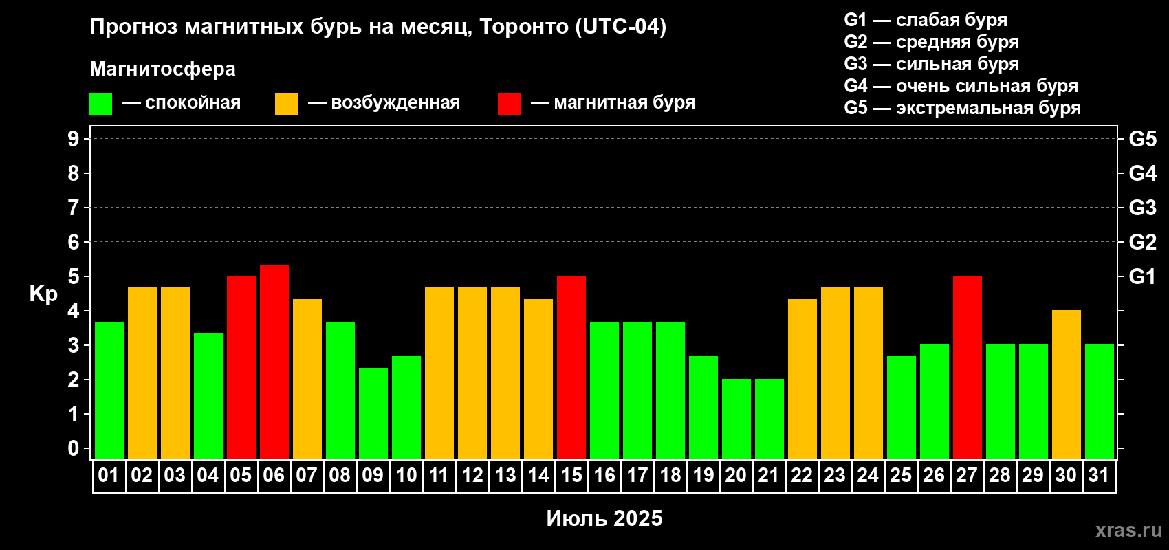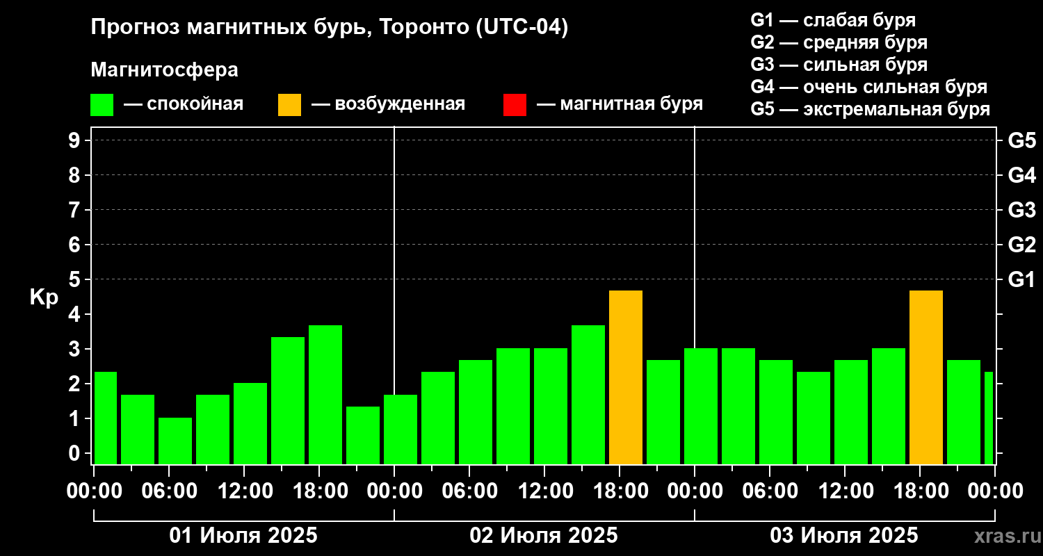 Прогноз магнитных бурь Торонто — 1 июля 2025 года