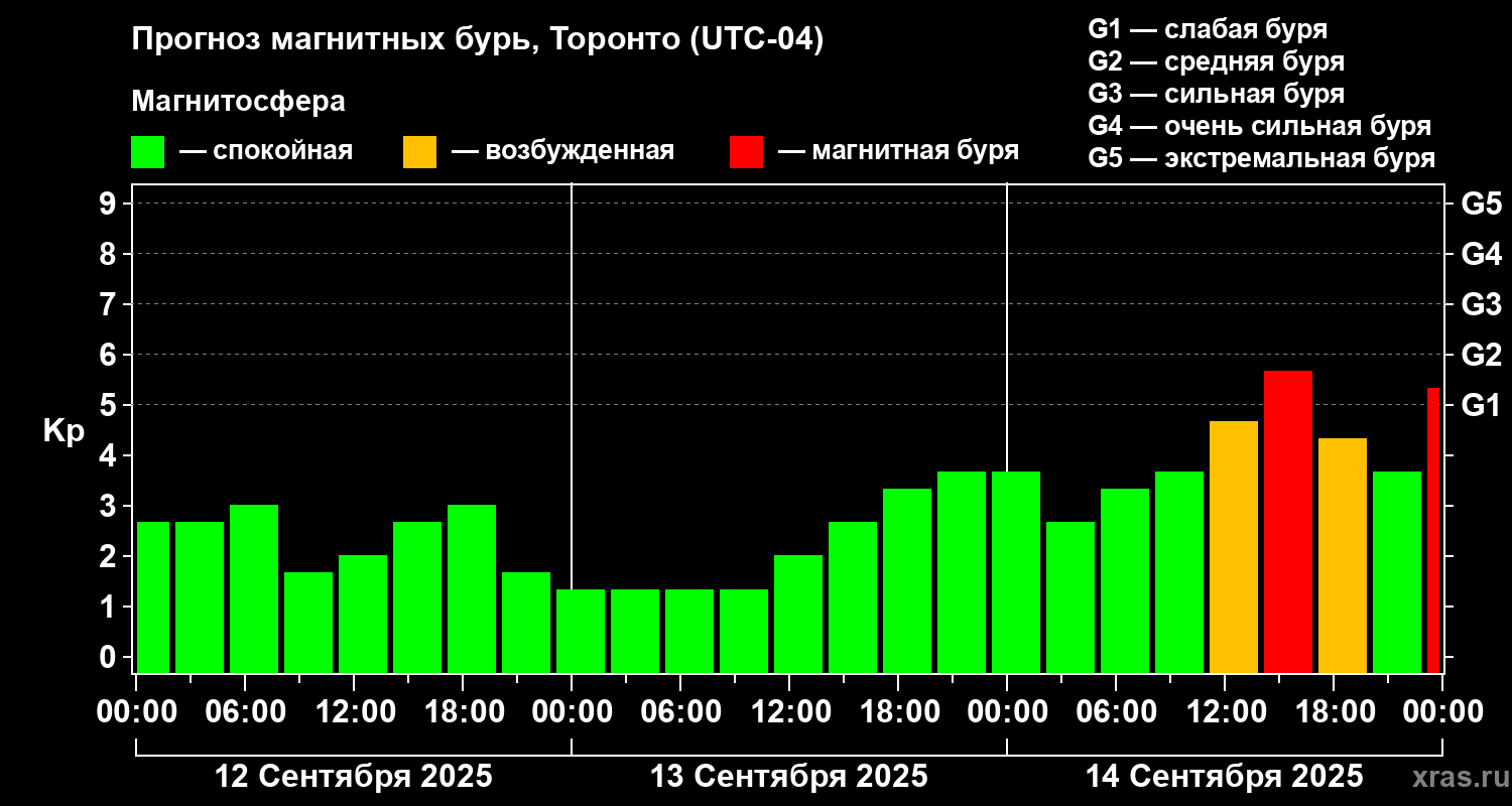 Прогноз магнитных бурь Торонто — 12 сентября 2025 года