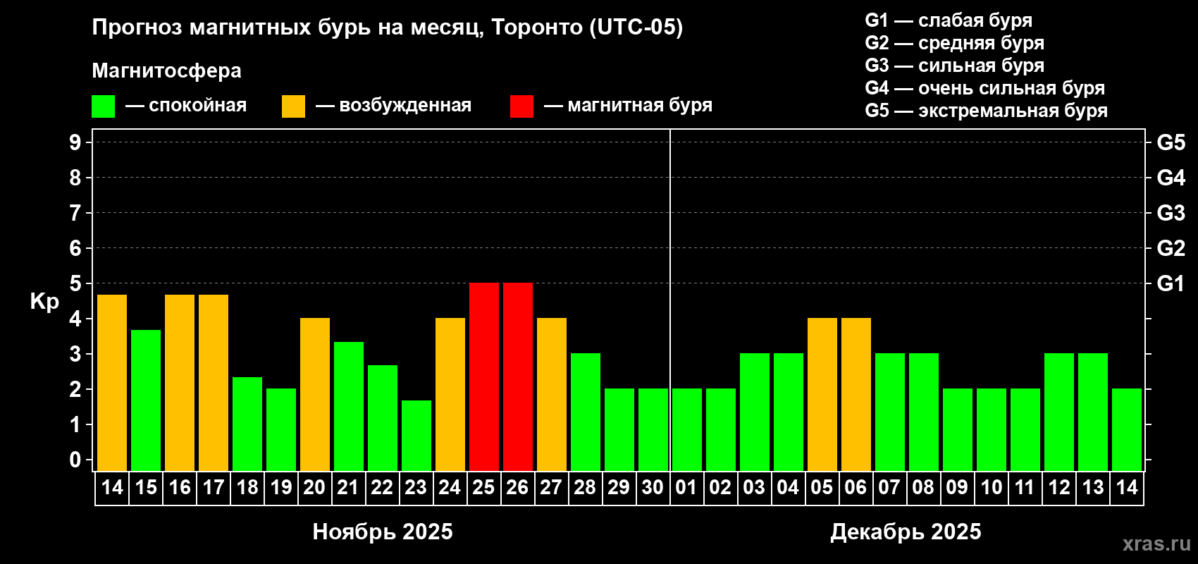 Прогноз магнитных бурь Торонто на 14 ноября 2025 года