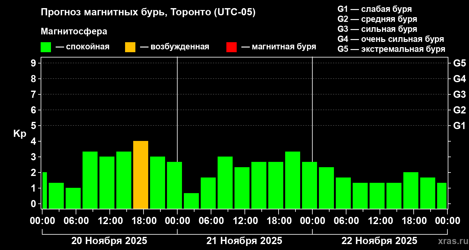 Прогноз магнитных бурь Торонто — 20 ноября 2025 года