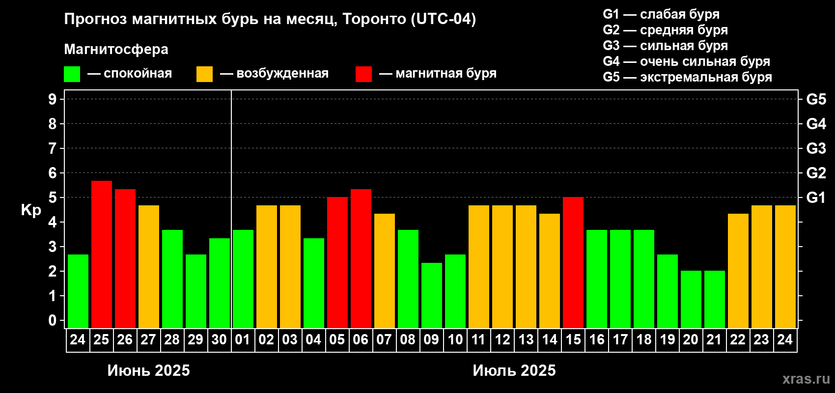 Прогноз магнитных бурь Торонто на 24 июня 2025 года