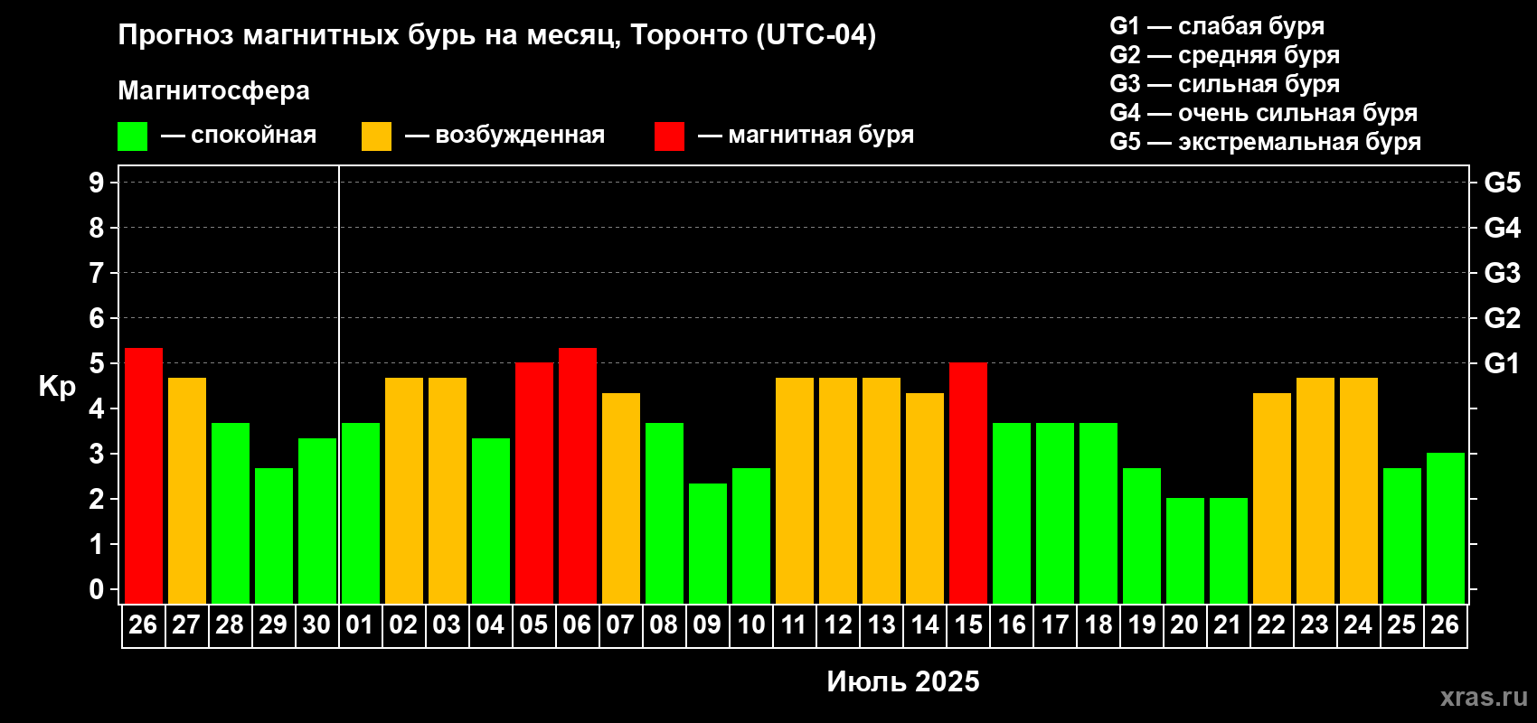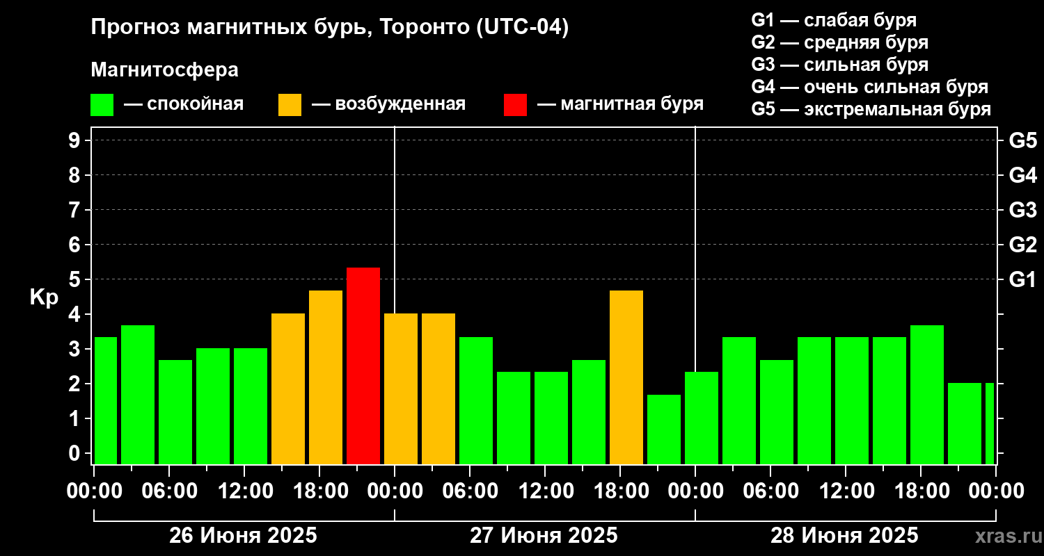 Прогноз магнитных бурь Торонто на 26 июня 2025 года