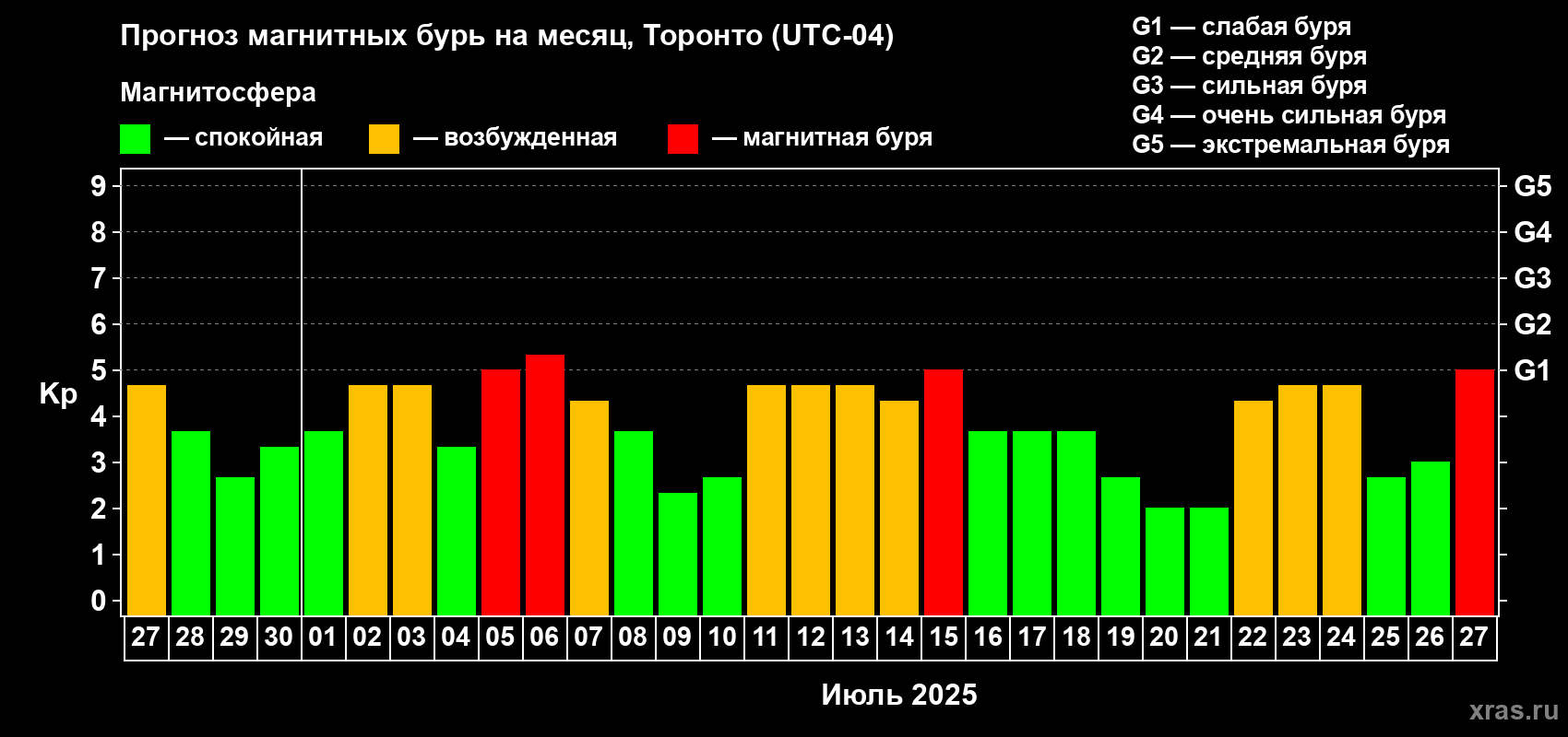 Прогноз магнитных бурь Торонто на 27 июня 2025 года