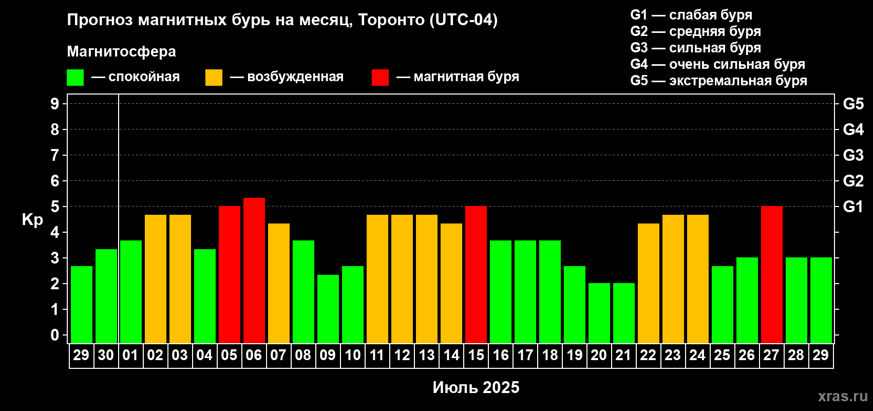 Прогноз магнитных бурь Торонто — 29 июня 2025 года