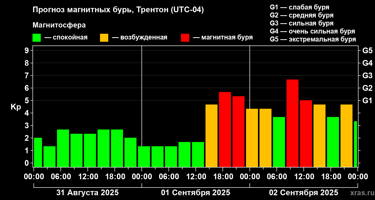 Прогноз магнитных бурь в Трентоне — 31 августа 2025 года