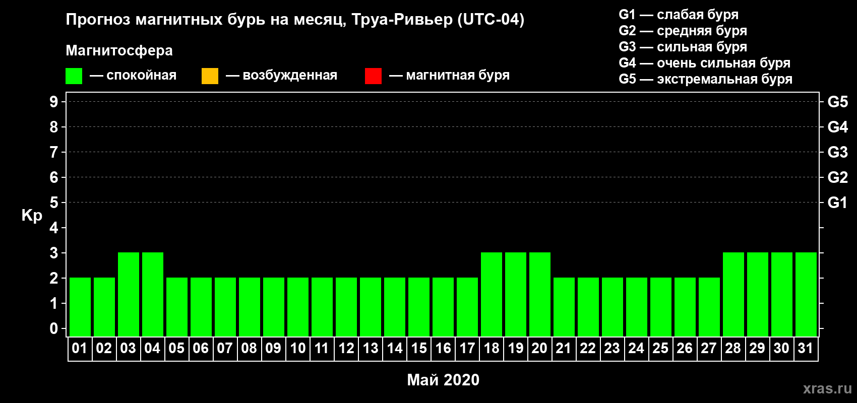 Прогноз магнитных бурь в Труа-Ривьере на 1 мая 2020 года