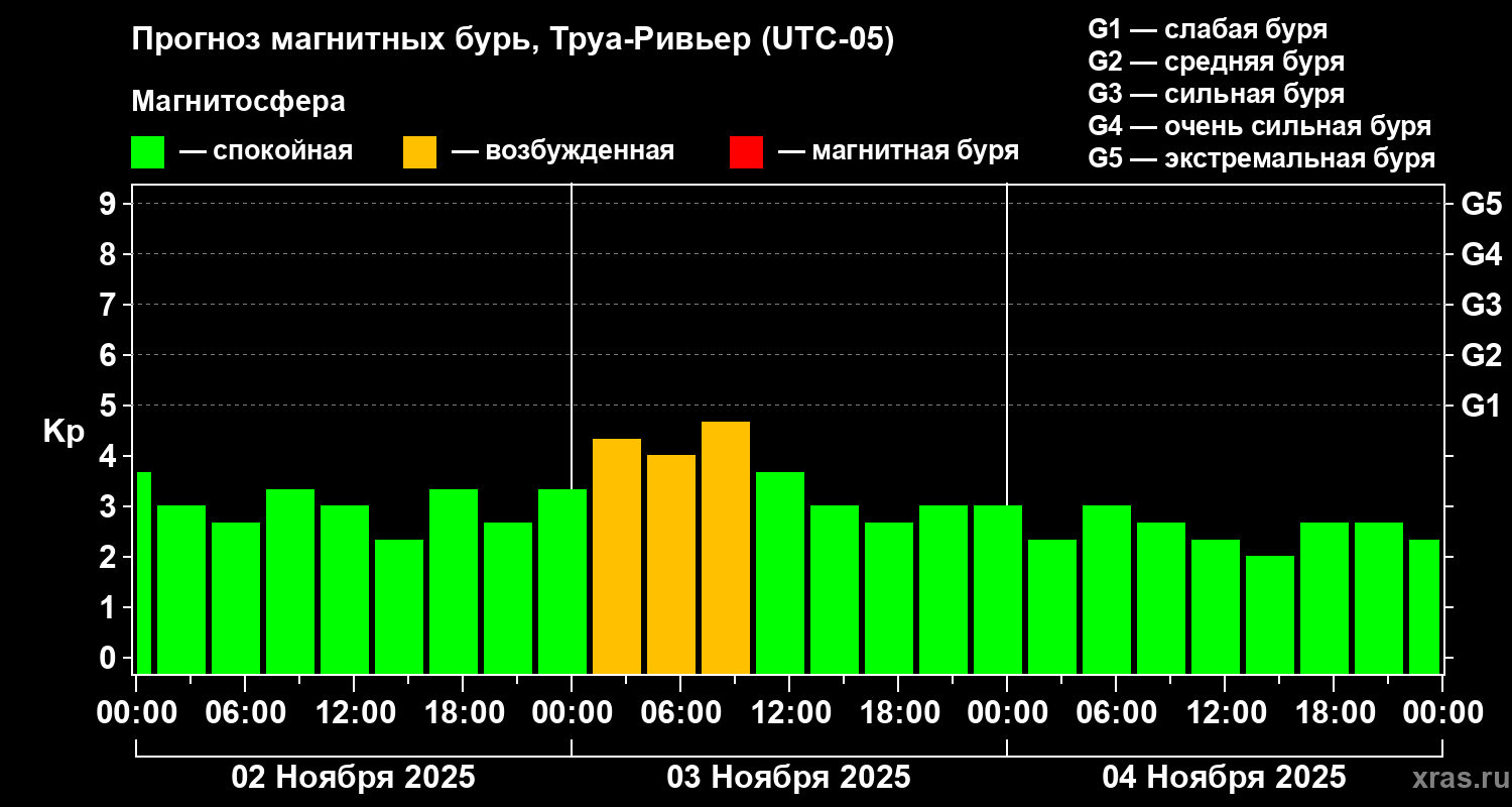 Прогноз магнитных бурь в Труа-Ривьере — 2 ноября 2025 года