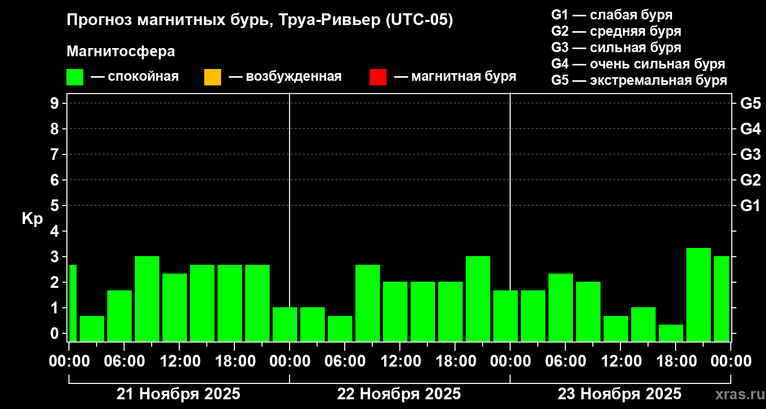 Прогноз магнитных бурь в Труа-Ривьере на 21 ноября 2025 года